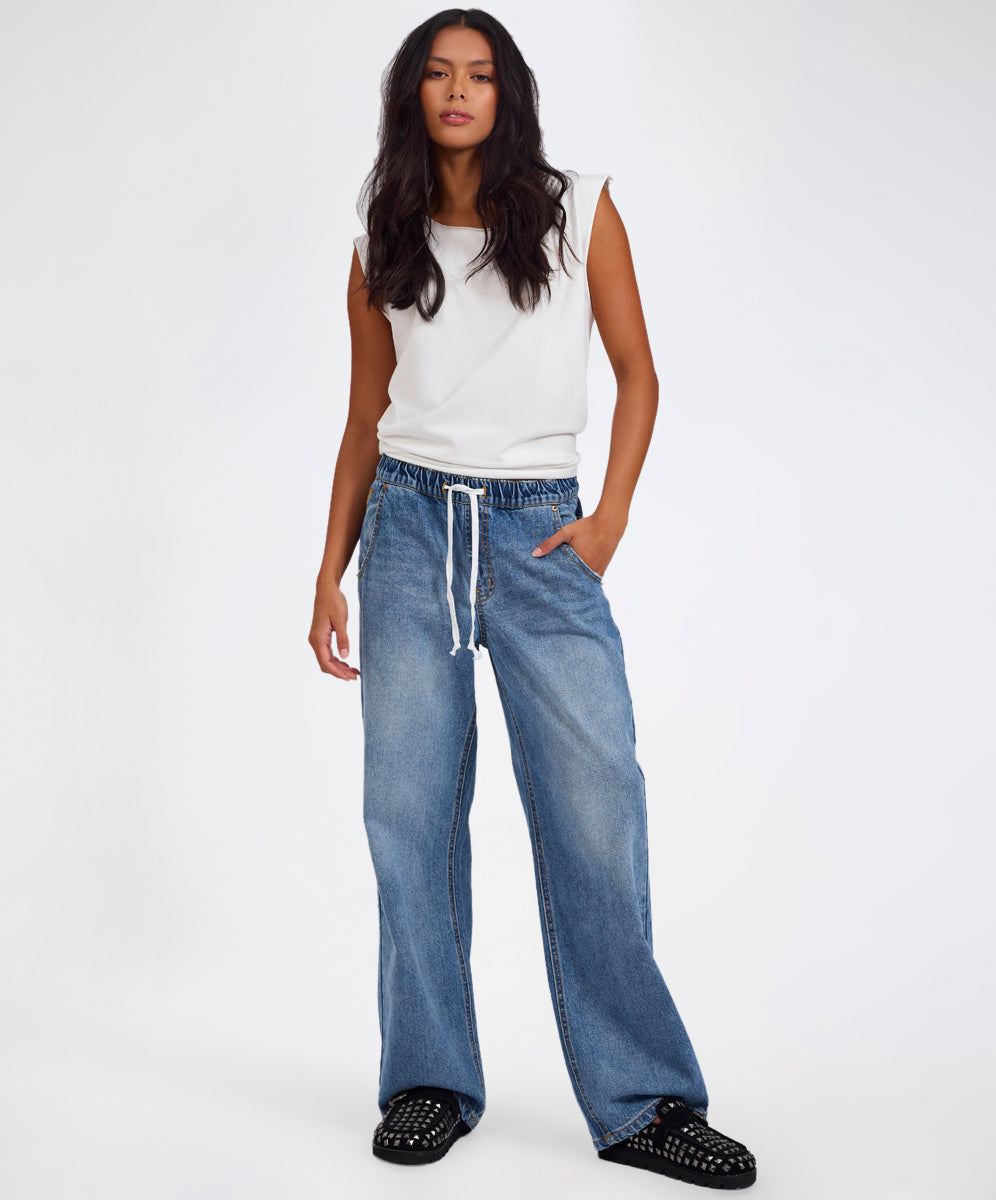 Roadhouse Mid Waist Wide Leg Drawstring Denim Jean - Hoodlum Blue