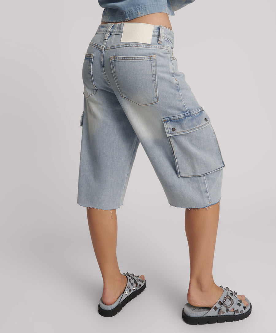 THE SKATER GIRL WIDE LEG SHORTS. A super long leg boyfriend denim shorts fit with big military utility-inspired skater pockets and details.