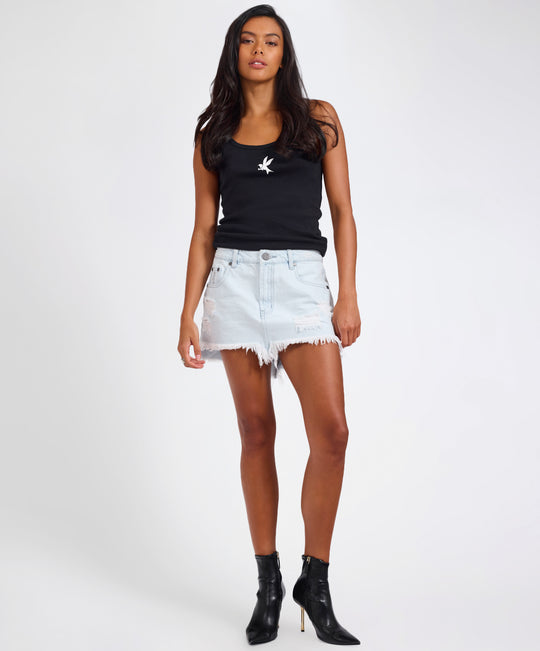 Our cult classic denim mini. Low waist, relaxed with the perfect fray.