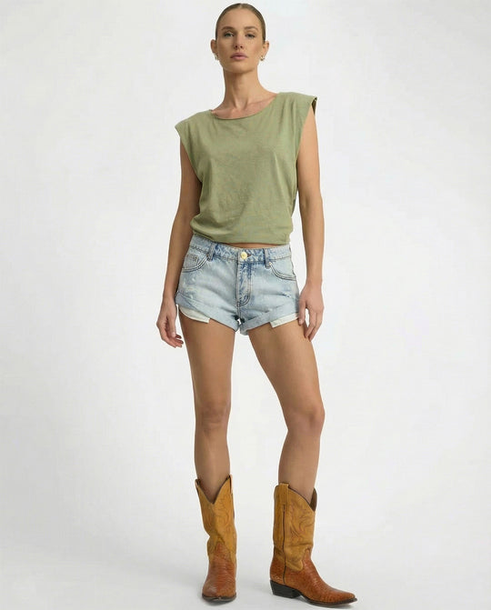 The Bandits Low Waist Denim Shorts in Kansas Blue have an easy vintage look, crafted with care. Featuring a relaxed, slouchy fit with large patch pockets and our signature rolled, twisted hem that sits low on the hips. Made with recycled cotton in a super washed-back light blue with natural aged tint—delivering that perfectly worn, lived-in look from day one.
