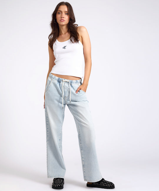 The blue latte ROADHOUSE MID WAIST WIDE LEG DRAWSTRING DENIM JEANS bring a bold twist to a relaxed silhouette. Designed with a mid-rise fit and wide legs, these denim jeans feature an adjustable drawstring waist for comfort and attitude.